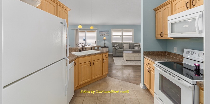 The kitchen has a bar overlooking the dining and living areas Kitchen is equipped with all you need to entertain! Enjoy amenities including central air condition, high-speed WiFi, and a full-size washer and dryer for your convenience.